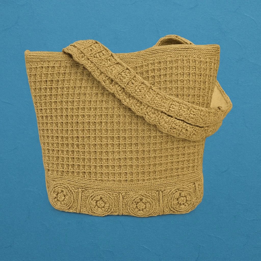 A stunning handmade crochet shoulder bag in a luxurious gold shade, featuring a spacious design with intricate floral accents along the base. This bag is both stylish and functional, making it ideal for casual outings, festive gatherings, or special occasions. The wide crochet strap ensures comfortable carrying, while the intricate craftsmanship adds a unique, elegant touch to your outfit.